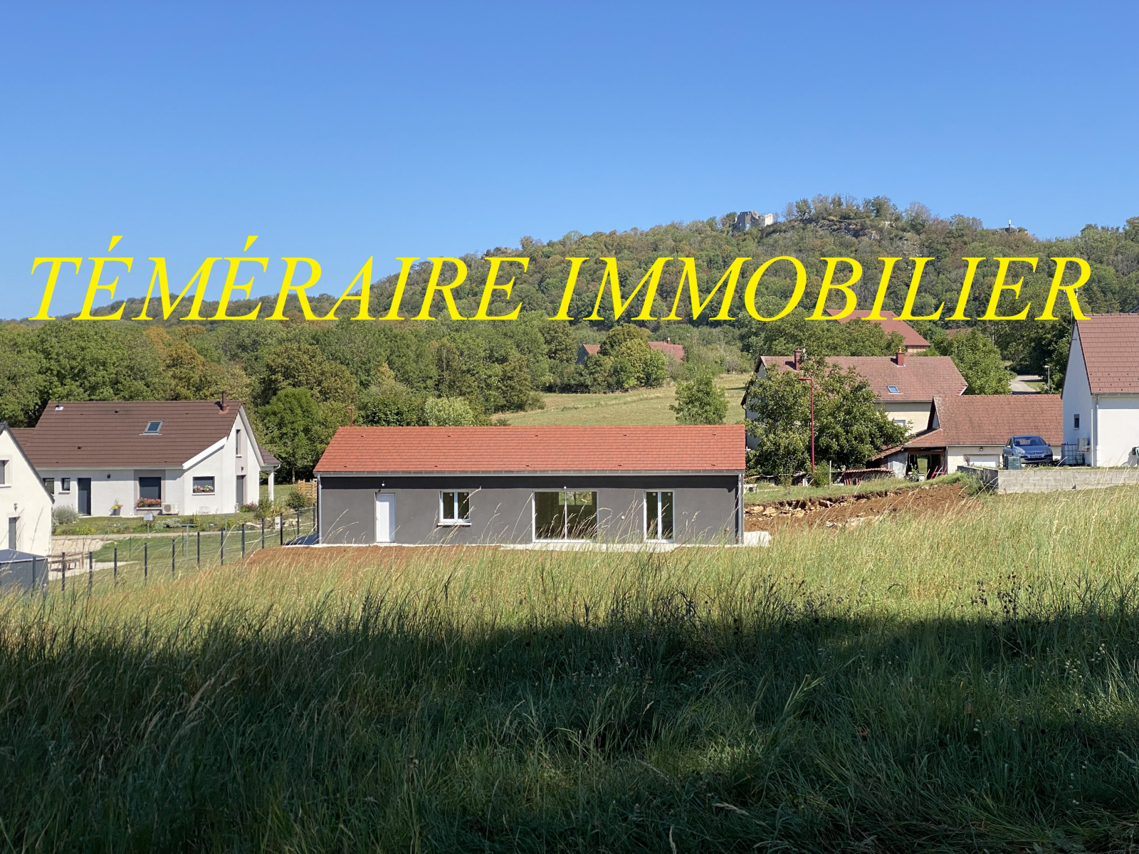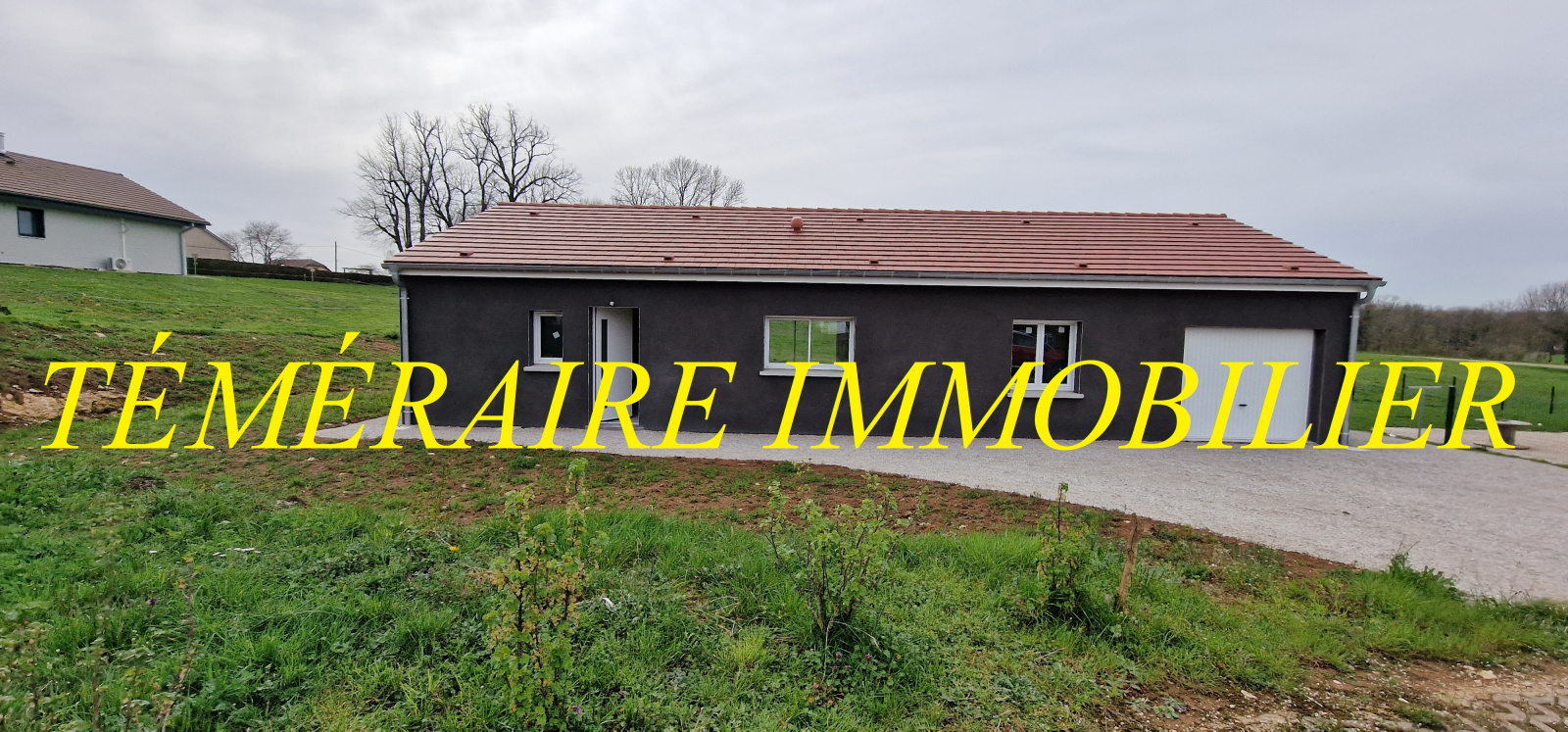 Axe Champagnole Lons-le-Saunier (Mirebel) - Maison neuve RT 2012 - Plain-pied - 90m² hab - Cuisine meublée équipée ouverte sur Séjour - 3chs dont 1 avec SDE - SDE - WC - Garage - Volets électriques - Chauffage PAC 2023 - Sur terrain de 1020m² - Finitions intérieures à prévoir (placo peinture + sols des chambres) - Réf. 5235
