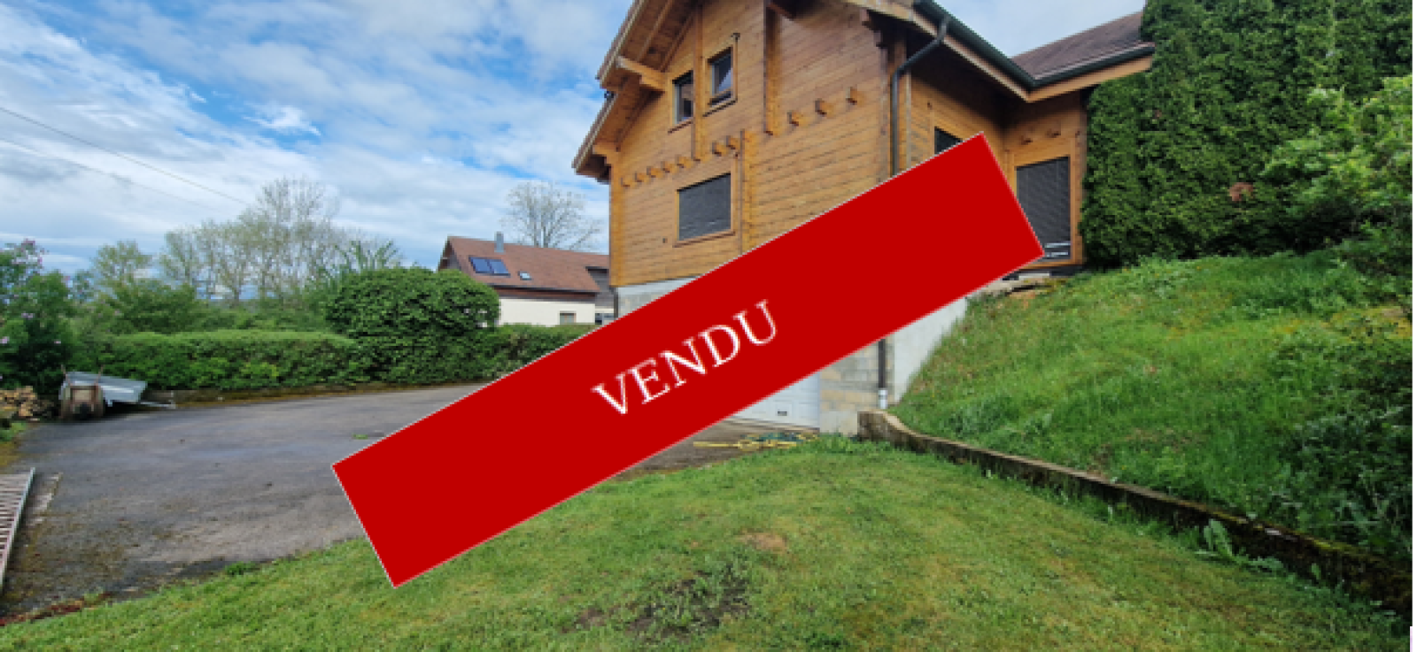 Proche Champagnole - Chalet de 161m² hab - Comprenant au RDC : 2 chs, WC, cuisine ouverte sur salon séjour de 55m² avec accès terrasse couverte ; à l’étage : 4chs, WC, SDB, dressing - Garage de 90m² - Cuisine d’été - Possibilité SDB au RDC - Sur terrain de 1673m² - Vue dégagée - Réf. 52